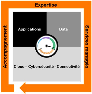 Nous adressons les besoins sur l’ensemble de la chaîne de valeur numérique, à travers une approche unique de bout en bout : de la connectivité au cloud, en passant par la Data (gestion des données via l’Intelligence Artificielle ou la Blockchain) et les applications collaboratives jusqu’à la cybersécurité. Nous bâtissons un environnement de confiance en tenant compte des volets technologiques, réglementaires et opérationnels.